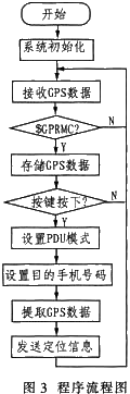 手持终端的相关程序用C语言编写,程序流程如图3所示。软件设计主要包括系统初始化、GPS数据处理、GSM数据处理3大部分。