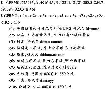 GPS模块输出的GPS定位信息服从NAME-0183通信标准。NAME-0183通信标准的输出数据采用的是ASCII码,其内容包含了纬度、经度、高度、速度、日期、时间、航向以及卫星状况等信息。语句有6种,包括GGA、GLL、GSA、GSV、RMC和VGT。本系统用到的是RMC纪录语句,它包含了定位系统需要的所有信息。格式举例: