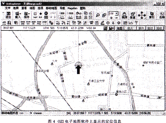 系统调试初步通过,还得测试其稳定性、分析误差所在。从实验结果得出,定位精度的误差基本上控制在25 m以内,误差原因主要来自两方面:首先是GPS模块硬件本身的性能误差。GSU-36要求工作电压为直流3.1 V~3.6 V(纹波≤50 mV)。且模块使用有源天线,若天线受附近电磁场干扰或GPS卫星所处位置不很理想时,定位精度会有不同程度的降低。另一方面,电子地图的分辨率也大大决定了定位点的精确性。OZI是一个支持自主测绘、编辑电子地图的软件。为达到理想的定位精度,可自行测绘一份更精细的电子地图。