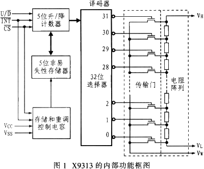 X9313为工业级的32抽头数控电位器,最大阻值为10 kΩ,采用8引脚,有DIP、OIC、FSSOP三种封装形式。X9313的内部功能框图如图1所示。它由输入部分、非易失性存储器和电阻阵列三部分组成。输入部分的工作就像一个升/降计数器,其输出经过译码,控制接通某个电子开关,这样就把电阻阵列上的一个点连接到滑动输出端。电阻阵列是由32个等值的电阻和与之相配套的电子开关组成。根据控制端的电平,计数器的内容还可以储存到非易失存储器以便以后使用。