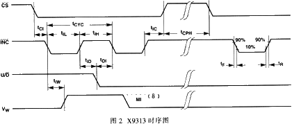 两个顶脚引线分别接VH和VL,中间抽头为VW。INC/U/D和CS为三个控制端,各引脚的功能如表1所列。CS为片选端,CS为低电平时,X9313选中。此时才能接收U/D和INC的信号。INC在下降沿使计数器增或减1(视U/D电平而定)。如果U/D=1,滑动端向VH方向滑动,Vw与VH之间的电阻减小一个阶值。反之,如果U/D=0,滑动端向VL方向滑动。计数器输出译码后,经过32选1,使滑动端的位置沿电阻阵列移动。当计数器达到某个极端(00000或11111)时,不会循环回复,从00000自动变成11111,或从1111 1变成00000,也就是说当CS为高电平而INC也为高电平时,计数器的值存储到非易失存储器中,系统上电时,器件自动将非易失性存储器中的值送到计数器,作为计数器的输出。X9313的时序如图2所示。