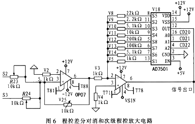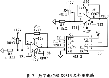 图5给出电路设计图。图6为差分对消电路及次级程控放大电路。图7为数字电位器X9313及外围电路。