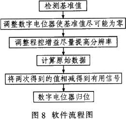 软件流程框图如图8所示。在软件设计中,每次调整完数字电位器的位置后必须将其归位,这一点是比较重要的,否则下次使用时将无法判断其真正的位置。