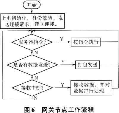 网关节点的主要作用是:接收各传感器节点的数据,并对数据进行相应处理后发送到监控中心;接收监控中心指令,确定节点的工作状态。其基本工作流程如图6所示。