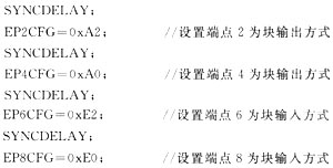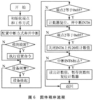 软件设计分为芯片CY7C68013固件程序设计和上位机应用软件设计,其中主要为固件程序设计,程序流程如图6所示。固件程序的开发应用Keil C51来完成,并且利用Hex2bix.exe在Keil C51的强大编译环境下将HEX文件转换成I2C文件,然后用EZ-USB Control Panel将I2C文件下载到E2PROM(24LC64)。在程序编写中,先将端点2和4设为块输出,端点6和8设为块输入。