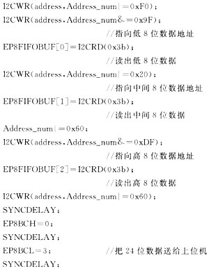 当一发炮弹射出后,炮弹经过前后线圈后产生一个计数值,利用I2C总线读出24位计数模块的数据,分高、中、低8位分别送回CY7C68013,然后通过USB 2.0传给上位机。