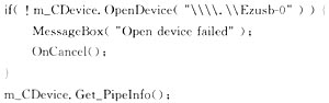 应用程序使用Visual C++6.0开发工具。测试炮弹速度时,先单击按钮"准备测试",然后打炮N发(N≤20),再单击"测试完成",炮弹速度就显示在左边文本框,从而实现单发或连发炮弹速度测量。新建MFC工程,在BOOL CUsbTestDlg::OnInitDialog()中打开USB设备,得到端点信息。
