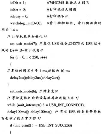 | 初始化过程分为单片机初始化和打印机的枚举初始化。单片机的初始化过程是直接向相应的I/0口写初始化值及设置看门狗,可调用函数watchdog_init()设置看门狗。 |