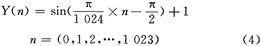 波形存储器调用LPM_ROM元件实现。为了得到1 024个10位正弦波的半周期无符号幅值样点数据,并生成相应的存储器初始化文件(*.mif文件),需要把正弦波波形移至x轴上方后进行采样。采样公式为:
