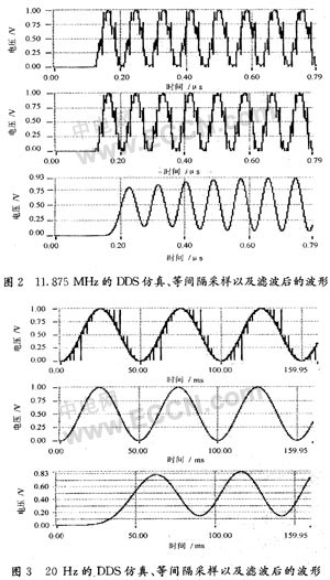 在LabWindows 8.0中使用他的高级信号分析库中的五阶切比雪夫低通滤波器函数对等间隔采样后的样点数据进行滤波,便可得到图2(11.875 MHz的DDS仿真,等间隔采样以及滤波后的波形)、图3(20 Hz的DDS仿真,等间隔采样以及滤波后的波形)的仿真结果。