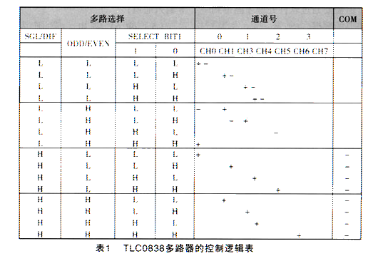 TLC0838可通过和微控制器相连的串行数据链路来传送控制命令,在使用前需要对通道进行选择和输入端进行配置,其控制逻辑表如表1所列。