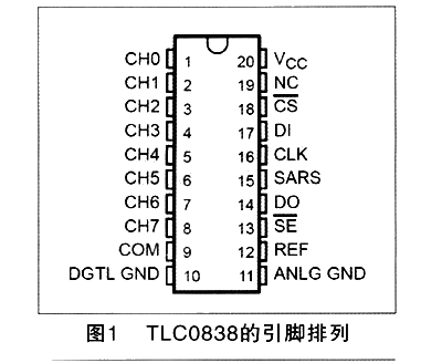 TLC0838的引脚排列如图1所示,其中CH0~CH7为模拟输入端;Cs为片选端;DI为串行数据输入,该端仅在多路器寻址时(MUX Settling Time)才被检测;DO为A/D转换结果的三态串行输出端;CLK为时钟;SARS为转换状态输出端,该端为高电平时,表示转换正在进行,为低电平则表示转换完成;REF为参考电压输入端;VCC为电源;DGTLGND为数字地,ANGL GND为模拟地,COM公共端;/SE为数据保持,输出,该端为高电平时,数据保存在数据线上,该端为低电平时,数据输出。