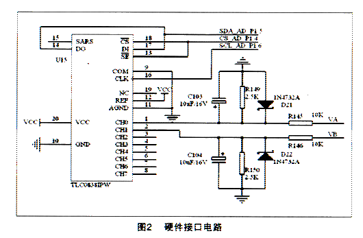 由于篇幅有限,图中只画出第0、1通道,模拟输入接口检测电路,VA接太阳能电压正极,VB蓄电池电压正极。其他通道接口电路与此相同。