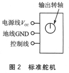 标准的舵机有3条导线,分别是:电源线、地线、控制线,如图2所示。