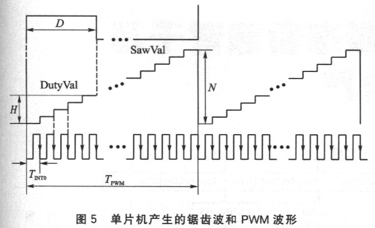 在模拟电路中,PWM脉冲信号可以通过直流电平与锯齿波信号比较来得到。在单片机中,锯齿波可以通过对整型变量加1操作来实现,如图5所示。假定单片机程序中设置一整型变量SawVal,其值变化范围为O~N。555振荡电路产生的外部计数时钟信号输入到AT89C2051的INTO脚。每当在外部计数时钟脉冲的下降沿,单片机产生外部中断,执行外部中断INT0的中断服务程序。每产生一次外部中断,对SawVal执行一次加1操作,若SawVal已达到最大值N,则对SawVal清O。SawVal值的变化规律相当于锯齿波,如图5所示。若在单片机程序中设置另一整型变量DutyVal,其值的变化范围为O~N。每当在SawVal清0时,DulyVal从上位机发送的控制命令中读入脉冲宽度系数值,例如为H(0≤H≤N)。若DutyVal≥SawVal,则对应端口输出高电平;若DutyVal