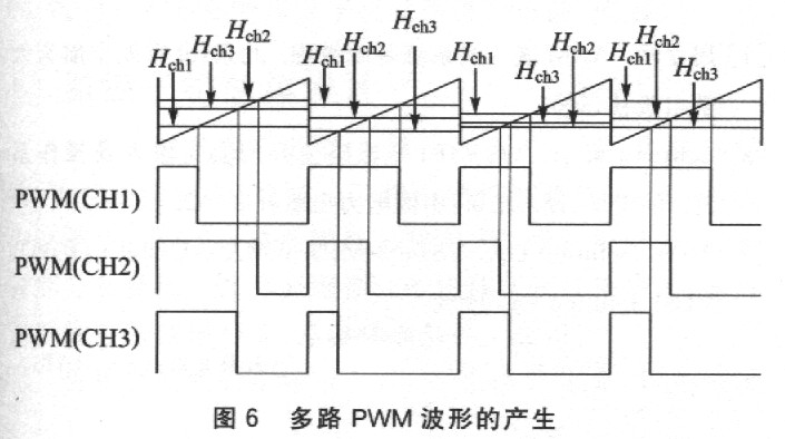 当有多个变量与SawVal比较,将比较结果输出到多个端口时。就形成了多路PWM波形。各个变量的值可以独立变化,因此各路PWM波形的占空比也可以独立调节,互不相干。多路PWM波形的产生如图6所示。图中以3路PWM波形为例。