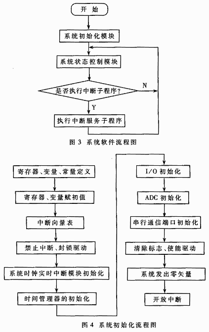 整个系统的软件采用C2000 DPS汇编语言编写。TMS320F240通过事件管理器启动ADC,获得电流、电压信号,实现对磁通、转矩的控制。整个软件包括三个部分:初始化、故障诊断、GP TIMER1中断服务程序。系统的软件模块流程图如图3所示。其中,初始化模块主要完成电机参数的给定、变量赋初值、定时器时间的设定、定时器服务子程序地址的设定等。初始化流程图如图4所示。