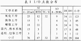 根据生产工艺要求,整个顺酐生产过程的输入/输出信号点数为304点,具体分布见表1。