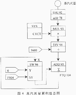 此外,整个生产过程还根据工艺要求设置了蒸汽流量、顺酸采出量和苯流量3个需经济考核的流量累积指标。由于没有配置流量积算仪和脉冲输入模块,流量累积只能通过组态有关算法模块实现。图4为蒸汽流量累积组态图,通过蒸汽流量输出模块UAI、系统模块SYS中的CYCT系统循环周期、乘法器MUL、除法器div将瞬时流量换算为累计流量,加法器ADD完成蒸汽流量的累积并输出。切换开关SW模块中,若操作员点击“清零”按钮,则SY=1(F104=1),模块输出为Y=0,加法器模块累加值清零,完成“清零”功能,否则继续累积。