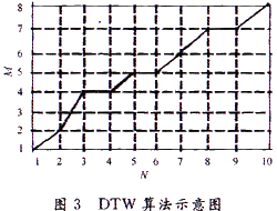 设测试语音和参考语音用T和R表示,他们分别含有N帧和M帧的语音参数。本文中每帧语音的特征参数为14维,因此T,R分别为N×14和M×14的矩阵。把测试语音的各个帧号x=1~N在一个二维直角坐标系中的横轴上标出,把参考语音的各帧号y=1~M在纵轴上标出,通过这些表示帧号的整数坐标画出一些纵横线即可形成一个网格,网格中的每一个交叉点(x,y)表示测试模式中某一帧号与训练模式某一帧的交叉点,对应于两个14维向量的欧氏距离。DTW算法在于寻找一条通过此网格中若干交叉点的路径,使得该路径上节点的路径和最小。算法示意图如图3所示。