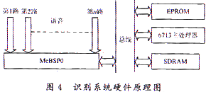 TMS320C6713有2个McBSPs(Multi-channel Buff-ered Serial Port,多通道缓冲串口),每个McBSP,可与多达128个通道进行收发。本系统中采用McBSP0实现数字语音信号到DSP的输入,DSP进行实时判别后输出结果。