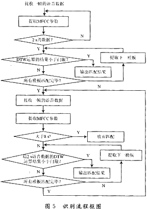 测试中采用10个参考模板,每个模板由相应的参考语音中2 s的语音数据训练而成。识别策略为每路积累2 s的接收语音数据后与逐个参考模板进行匹配,如果经由DTW运算所得的距离值小于特定的门限,就判决已匹配。如果不匹配,就继续接收匹配,超过8 s匹配不上,就放弃。软件流程框图如图5所示,其中语音数据的采样率为8 000 Hz,每帧取256个采样点,即32 ms的数据为一帧。