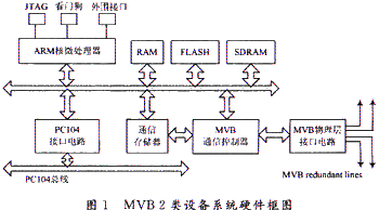硬件系统设计主要包括应用处理器模块、通信存储器模块、通信控制器模块、存储器模块、PC104接口模块、物理层接口模块等几部分的设计,其中核心模块是ARM处理器和MVB通信控制器MVBC01。系统硬件设计框图如图1所示。