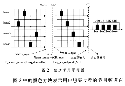图2中的黑色方块表示用户想要收看的节目频道在 整个节目通道中所处的位置,白色矩形框表示与信道对应的传输通道,频带范围在950~2150 MHz之间,横坐标表示频率空间。bank 1~。bank 4表示高频头1~4路输出信号。此处理分2部分,信号移频和信号复用。移频由SCR芯片来完成,复用由加法器来实现。
