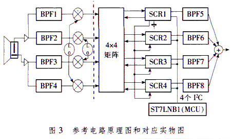 图中4×4矩阵在实际电路中由2片HMC276芯片组成,用于选择打开bank l~bank 4中某一通路信号,供SCR芯片进行移频处理,SCR的移频工作在ST7LNB1的控制下实现,其中每个SCR芯片的中心频率不同,与图2中UBO~UB3的中心频率对应,此中心频率是由芯片固有性质决定的,常在同一系统中使用的组合有4路组合及8路组合等,它们对应的用户带宽(UB)分别为60 MHz和40 MHz。这些中心频率是由硬件确定的,但在实际使用中,是由机顶盒发送DISEQC命令检测得到。本方案中的降频参考图3分2次实现,第一次降频在图3虚线左侧实现,之后矩阵输入信号频率Freq_martrix_input=|Freq_down_Flo|。第二次降频在图3虚线右侧SCR中实现,之后SCR输出信号频带中心频率Freq_scr_output=F_SCR。需要说明的是,第二次降频由ST7LNB1控制SCR来实现,参考SCR的数据表可知,SCR可以将950~2150 MHz范围的任意信号频移到其中心频率附近的带宽范围内,这一点由机顶盒发送DISEQC命令向ST7LNB1传送相关参数信号来确定,主要是本振和SCR中心频率。Freq_down是卫星下行信号经窄滤波器滤波后的信号载频,Flo为高频头本振频率。SCR后面的带通滤波器(BPF)用于滤除用户带宽之外的信号,防止复用时信号串绕失真。BPF'的频宽和中心频率与各SCR一一对应。