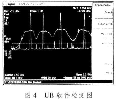 图中,尖锋脉冲为机顶盒发送DISEQC命令后线缆中的信号,可反映SCR中心频率的状况,4个带通范围为发送DISEQC一段时间后通路中的信号,反映此电路模块对信号的增益情况,是信号可存在的有效频带范围。经观察,上述4个脉冲对应在1210 MHz,1420 MHz,l680 MHz,2040 MHz的中心频率上,在ST7LNBl的控制下产生的。机顶盒系统发送UB_SINGAL_ON( )命令向SCIF模块传输一些数据信息,对ST7LNB1写入一些数据,包括所有可能存在的SCR中心频率,共12个,当这些频率与ST7LNBl中存储的与本硬件电路相关的SCR中心频率数据库相符合时,ST7LNBl会控制系统在相应频点发送反馈的脉冲信号。机顶盒捕捉到这些信号之后可获得不同SCIF模块的固有频点,同时通过查对应的数据表得到对应的UB带宽。上述4个通带是发送DISEQC命令一段时间后示波器检测到的信号,它反映了系统对白噪声的信号增益。