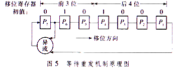 由于各机顶盒使用同一根下行线缆来传输DISEOC信号和下行反馈信号,且各DISEQC命令都加载在22 kHz的频率上进行传输,当通路中同时存在多个机顶盒发送的DISEQC命令时,线缆中的信号将产生冲突而无法辨识。为解决这一问题,本方案采取命令重发方式,重发等待时间由线性反馈移位寄存器获得,如图5所示。
