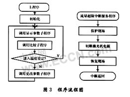 系统软件由主程序模块、功能实现模块及比较运算控制模块组成,流量超限中断服务程序模块。使用C语言编写微控制器PIC16F876的执行程序,系统主程序流程及流量超限中断服务程序如图3所示。