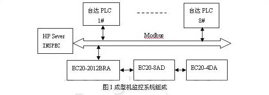 成型机监控系统主要包括上位机组态界面、通信协议、PLC控制系统三部分。系统结构图如图1所示。组态软件选用北京九思易自动化软件有限公司开发的易控(INSPEC)。易控(INSPEC)软件能够支持同时与不同的PLC设备的通信。