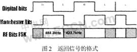 电子标签首先将原始数据(digital bits,即要返回的标签信息)进行曼彻斯特编码(manchester bits),然后再用编码后的数据信息以FSK方式调制到低速率的子载波423.75kHz和484.28kHz信号上(RF Bits FSK),即曼彻斯特码的高电平部分使用484.28kHz方波信号表示,低电平部分使用423.75kHz方波信号表示。最后再由子载波调制到13.56MHz的载波上,以此方式回传给读头。返回信号编码及子载波形式如图2所示。