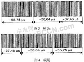为了达到数据的传输同步,电子标签在曼彻斯特码的起始和结尾分别加入帧头和帧尾,帧头部分为11100010,用423.75kHz和484.28kHz信号调制后如图3所示。帧尾部分为01000111,与帧头的顺序完全相反,调制后如图4所示。