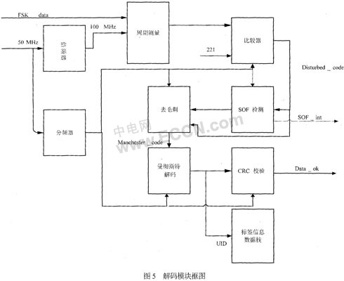按照图2所示数据格式的逆顺序进行解码,首先将RF Bits FSK信号还原为Manchester Bits信弓。此部分由图5中的倍频器、周期测量模块和比较器三个模块实现。在本设计中计数器在高频时钟信号(本设计采用100MHz时钟信号)的驱动下,测量FSK信号中相邻的两个信号上升沿之间的计数值,依此来区分423.75kHz和484.28kHz两个频率的信号。