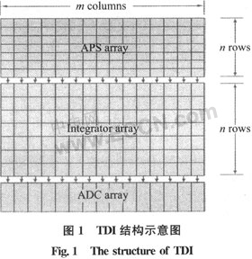 TDI是指对同一移动中的物体进行多次曝光并将其积累。由于感光器积累多次的入射光,图像信号及整体亮度也相应大幅提升。在对入射信号累加的同时,对噪声信号也进行了累加,因此低噪声的电路设计成了设计中的重点。CMOS-TDI结构如图1所示,它类似于普通面阵CMOS图像传感器,n级的TDI由n行像素单元、积分阵列组和列并行ADC组成。其中,m为像素单元的个数,n为级数。本设计中,n=32。