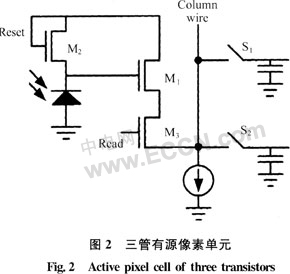 像素单元的物理结构包括光电二极管、行选信号、电源、地信号和源跟随晶体管等。由于有源像素相对于无源像素有低读出噪声、可集成到更大规模阵列和高速读出等优势,采用三管有源像素结构。该结构的填充系数相对较高,而且寻址方式简单。其电路结构如图2所示。