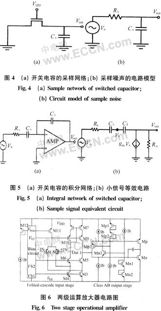 采样阶段获得的电荷在积分阶段传输至积分电容。开关引入多余的热噪声,引入的噪声被运放和开关的开启阻抗以及电容形成的时间常数所带限,如图5所示。