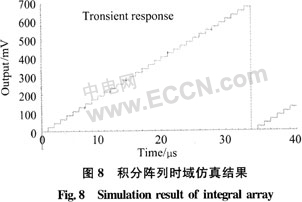 在标准CMOS工艺下,通过合理的时序关系,TPI电路可由积分阵列来实现。图8为-32级TDl电路的仿真结果,积分阵列对32行的像素信号进行积分累加,实现了TDI功能。
