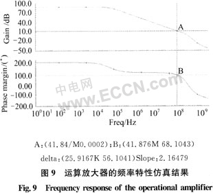 采用SMIC O.35μm CMOS工艺,本文设计的运放可以达到大约80 dH的直流增益,40 MHz的单位增益带宽,65°的相位裕度。图9为spectra仿真的运放频率特性区线。