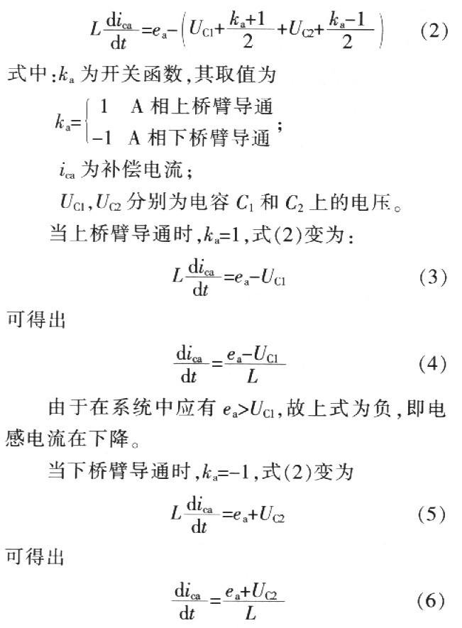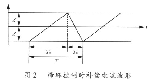设UC1=UC2=Ud/2,假定逆变器的工作开关频率较高,在一个开关周期内可认为电压ea基本不变,则滞环控制时补偿电流的波形如图2所示,其中δ为滞环宽度。