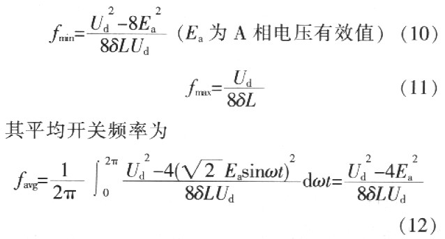 取电流滞环宽度δ为1.2A,直流侧电压Ud为l000V,主电路电感L为5mH,则由上述公式可得:最小开关频率为12.767 kHz,最大开关频率为20.833kHz,平均开关频率16.8 kHz。