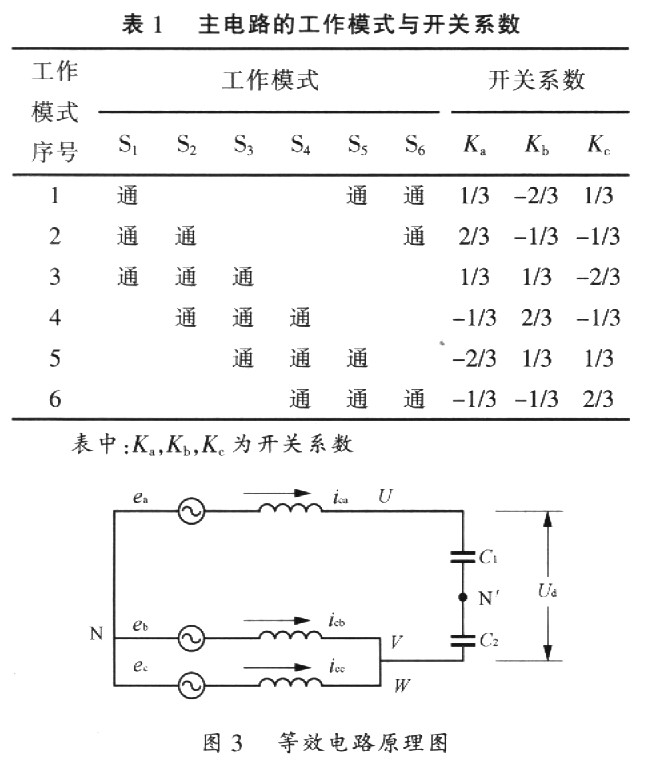 主电路的工作模式及相应的开关系数,如表1所列,等效电路图如图3所示。