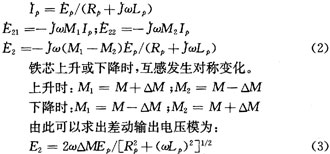 设差动变压器原边激励电压为Ep、角频率为ω、电流为Ip、电感为Lp、等效电阻为Rp。副边电压分别为E21、E22,互感为M1、M2。若忽略磁滞涡流及耦合电容的影响,可以得出: