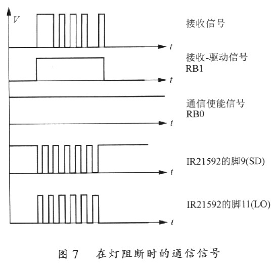 在灯管触发之后,PIC16F628脚14(VDD)上的供电电流由镇流器半桥输出上的电荷泵电路提供。微控制器在正常工作期间,内部频率为4 MHz。当IR21592脚9(SD)上的电压VSD>2V时,半桥截止,电荷泵电路失能,PICl6F628脚14(VDD)上的电流由桥式整流输出经高阻值电阻(270 kΩ)供给,微控制器进入睡眠模式,消耗非常小的电流。欲唤醒微控制器使其重新开始工作,需要供给足够的电流。图7所示为在灯被关断时的通信信譬。