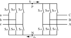 对于图2的等效交—直—交结构,j∈{a,b,c,A,B,C,},k∈{P,N}。按照输入电压不能被短路,输出电路不能突然开路的原则,虚拟整流器同一直流母线P或N上的开关必须有一个且只能有一个处于导通状态,即