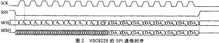 C8051F005使用4个特殊功能寄存器来实现对SPI的控制和访问。这4个寄存器分别是控制寄存器(SPI0CN)、数据寄存器(SPI0DAT)、配置寄存器(SPIOCFG)和时钟频率寄存器(SPI0CKR)。当以C8051F005为主器件时,应将主允许标志(MSTEN,SPI0CN.1)置1,同时将SPI使能SPIEN(SPI0CN.0)置1。通过CKPHA(SPI0CFG.7)和CKPOL(SPI0CFG.6)可选择SPI相位与极性,从而实现SPI通信的四种模式,但因为VSC8228只支持一种方式,所以将它们同时置为0,则空闲时SCK为低,此时的系统将在上升沿发送数据,下降沿接收数据(时序图见图2)。由于在MCU中,SCK的频率可从系统时钟分频得到,因此该频率可由下式给出: