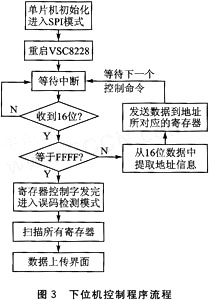 下位机采用中断方式实现与上位机的通信,单片机用SPI与VSC8228误码测试模块的通信。每当串行口接收或发送完一组串行数据时,就产生一个中断请求。串行中断请求在单片机芯片内部自动由硬件置位发生,具有实时性高的特点。图3是单片机的控制程序流程。