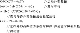 系统时钟初始化模块,由于是选择外部晶振作为时钟源,根据C8051F005的要求,在通过外部振荡器控制寄存器OSCXCN选择了外部晶振后,需等待至少1ms后再查询等待OSCXCN寄存器中的D7位,即XTLVLD位变为1,表明外部晶振正在运行并已工作稳定,然后才能通过内部振荡器控制寄存器OSCICN的D3位,即CLKSL置1来选择外部晶振。